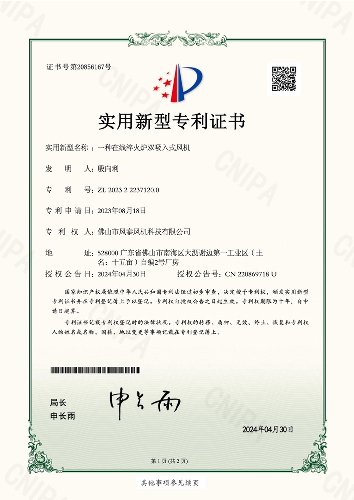 一種在線淬火爐雙吸入式風(fēng)機(jī)-專利證書