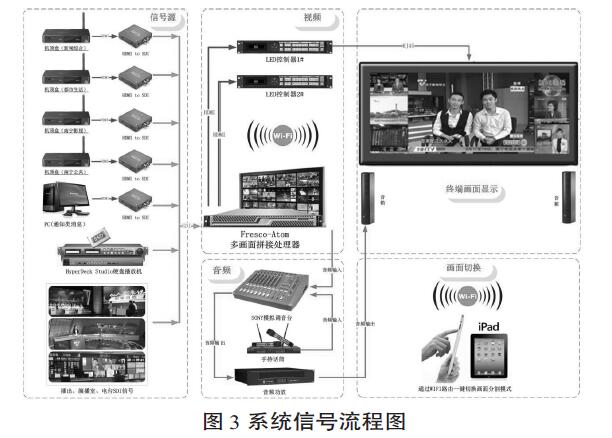 電視臺主要以拍攝和播出視頻節目為主,我臺現有記者采訪設備及編輯設備已經達到高清化制作水平,部分精品類的晚會、專題片、微電影已經實現高清、2K、4K制作,但是目前我臺播出的節目仍舊以標清播出為主。系統設計之初,在滿足現有標清播出的前提下,考慮到日后高清化播出要求,大屏幕播出信號必須兼容高清。由于采用P3的屏幕,物理分辨率已經很過高清,系統需采用兩套LED控制處理器進行拼接,然后把圖像信號轉換成網絡信號傳送給屏幕。由于輸入信號源較多(表 1),系統采用多大洋Fresco-Atom矩陣式畫面分割處理器,分別輸出兩路拼接后的HDMI信號給到LED控制器,該處理器較大支持拼:接成4K分辨率3840x2160顯示。另外,PC端遙控面板不僅可以對16x2矩陣進行控制,還可對多畫面布局進行快速切換,并且可以將任意輸入信號瞬間切換至全屏或“主窗口”顯示。支持信號任意拼接任意縮放、任意復制、任意位置布局等。同時,系統可通過WIFI路由器組成無線網絡,支持iPad控制,方便其他外來單位來我臺參觀學習時,講解人員可以在大堂中廳,通過iPad遠程遙控畫面。